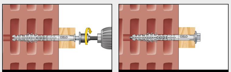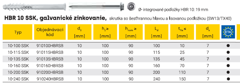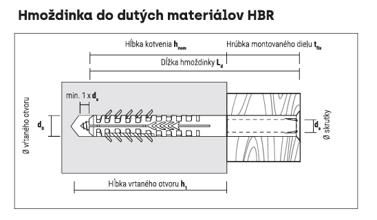 Rámová hmoždinka do dutých tvárnic HBR so šesťhrannou skrutkou s integrovanou podložkou (SW13/TX40) a veľkou nastavovacou hĺbkou 90 mm je špecializovaná rámová hmoždinka schválená spoločnosťou ETA na upevňovanie do dierovaných stavebných materiálov, ako sú duté tehly a tvárnice.