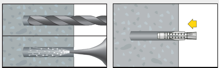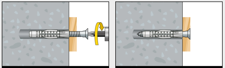 Použijeme dlhšiu skrutku ako je hmoždinka a materiál spolu aby skrutka prešla cez koniec hmoždiny a dobre sa roztiahla.