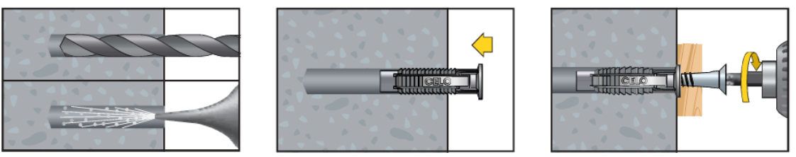 - skrutku dotiahneme skrutkovačom a pri použití do sadrokartónu musíme skrutkovať dlhšie, aby sa nám hmoždinka zauzlila