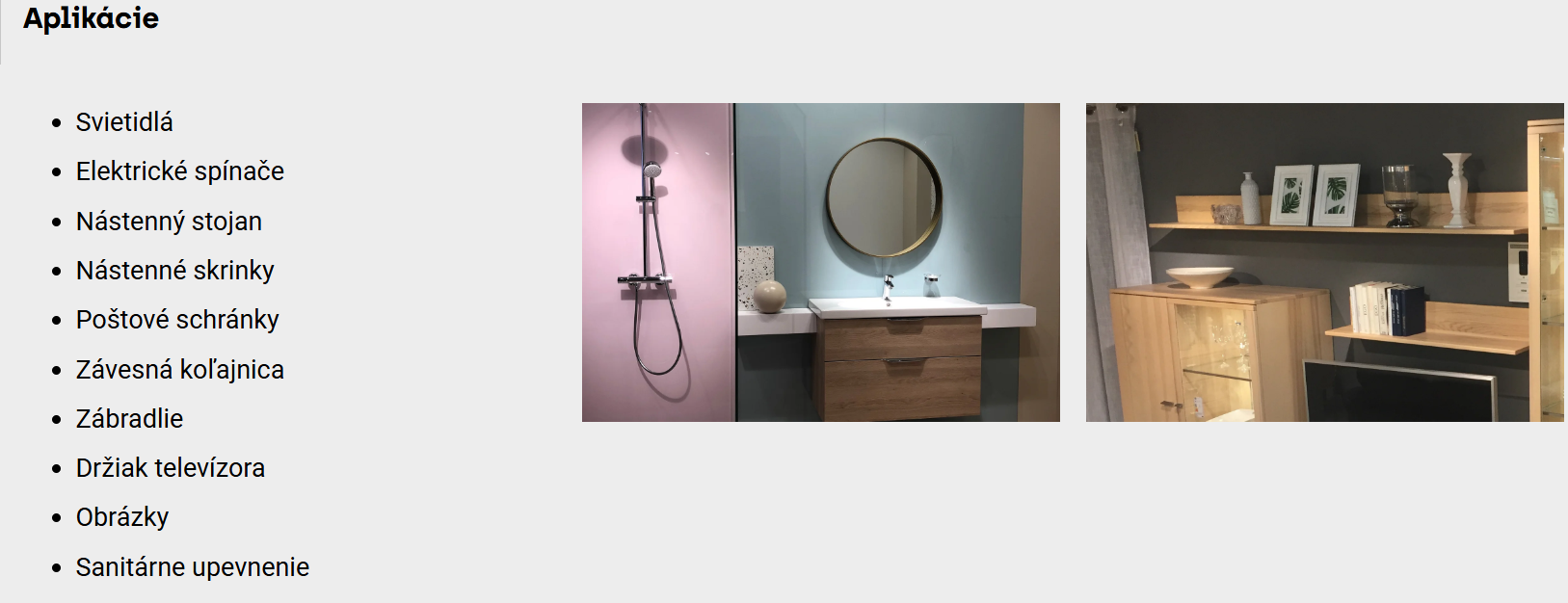 Vďaka teplotnej odolnosti od -40 °C do +80 °C je hmoždinka FX vhodná na širokú škálu aplikácií, od osvetľovacích a sanitárnych inštalácií až po nástenné skrinky a police.