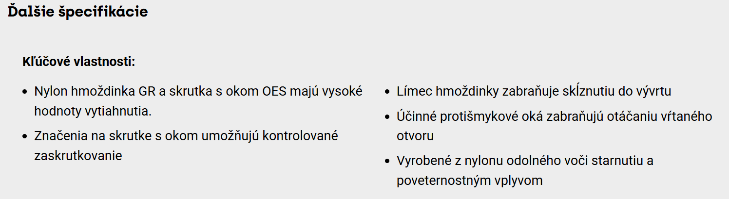Nylonová hmoždinka GR sa optimálne zhoduje so skrutkou OES pre vysoké hodnoty vytiahnutia.