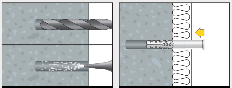 Vyvŕtame dieru o priemere 14mm a následne ju vyfúkame a osadíme hmoždinku