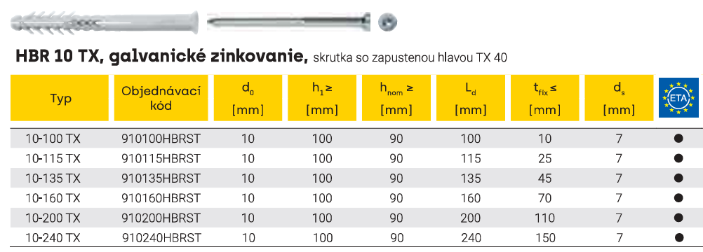 HBR 10 je schválená pre murivo len v spojení s našimi pozinkovanými bezpečnostnými skrutkami so zapustenou hlavou (TX 40).