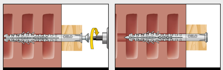 Rámová hmoždinka do dutých tvárnic HBR so zapustenou skrutkou (TX 40) a veľkou hĺbkou osadenia 90 mm je špecializovaná rámová hmoždinka schválená spoločnosťou ETA na upevnenie do dierovaných stavebných materiálov, ako sú duté tehly a tvárnice.