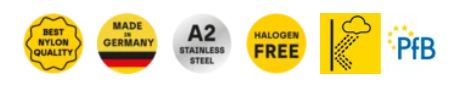 Predmontovaný tesniaci krúžok vyrobený z pórovitej gumy odolnej voči poveternostným vplyvom. Samovrtné (ETICS omietka 7 mm) a robustná nylonová zátka, odolná voči starnutiu. Špeciálny závitový kolík s povrchovou úpravou lamelové zinkovanie zaručuje vysokú odolnosť proti korózii.