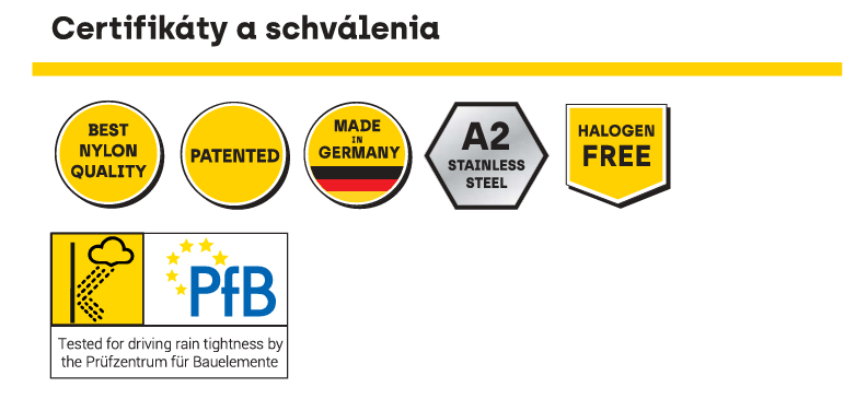- Predmontované tesnenie z EPDM odolné voči poveternostným vplyvom zabezpečuje bezpečné utesnenie proti nárazovému dažďu až do sily vetra 11 (silná búrka) a posunu do 3 mm, testovaná vodotesnosť podľa normy DIN EN 1027.