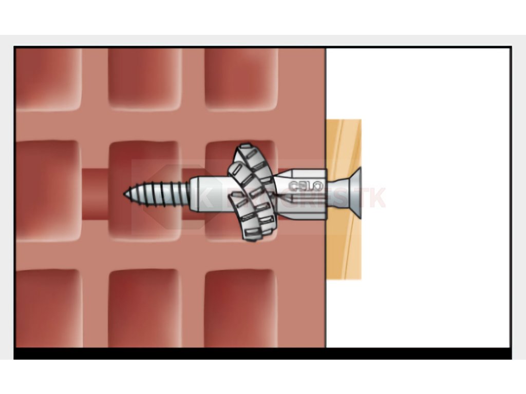 CELO viacúčelová hmoždinka MZK je vhodná pre takmer každý stavebný materiál. Vďaka 4-strannému rozpínaniu v pevných stavebných materiáloch a uzlovaniu v dierovaných tehlách alebo doskových materiáloch hmoždinka vždy poskytuje bezpečné upevnenie s vysokými zaťaženiami.