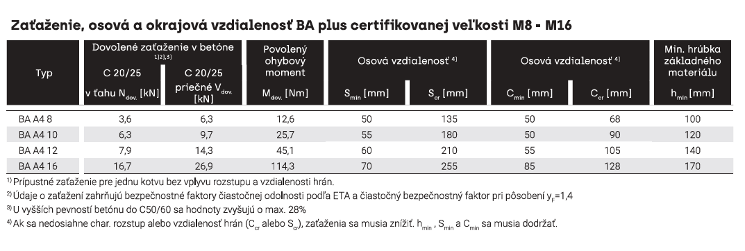 Výhodou kotvy BA A4 je, že ju možno použiť v náročných montážnych situáciách vďaka malým vzdialenostiam hrán a stredov. Na inštaláciu vyvŕtajte a vyčistite otvor, zatlčte kotvu BA A4 a utiahnite ju. Informácie o krútiacom momente, šírke naprieč plochami a priemere voľného otvoru v prípravku nájdete v technických listoch.