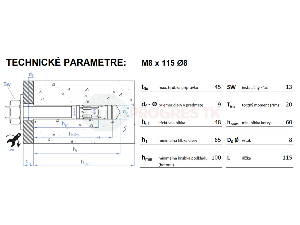 Pomocou momentového kľúča dotiahnite maticu určeným kontrolovaným uťahovacím momentom (torque). Počas uťahovania sa rozpínacie segmenty roztiahnu a kotva sa pevne zafixuje v betóne.