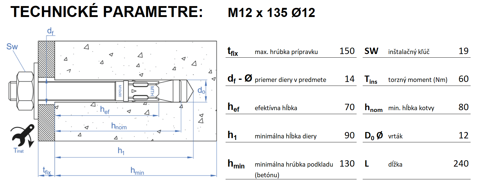 Pomocou momentového kľúča dotiahnite maticu určeným kontrolovaným uťahovacím momentom (torque). Počas uťahovania sa rozpínacie segmenty roztiahnu a kotva sa pevne zafixuje v betóne.