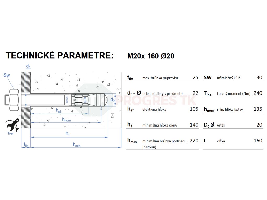 Pomocou momentového kľúča dotiahnite maticu určeným kontrolovaným uťahovacím momentom (torque). Počas uťahovania sa rozpínacie segmenty roztiahnu a kotva sa pevne zafixuje v betóne.