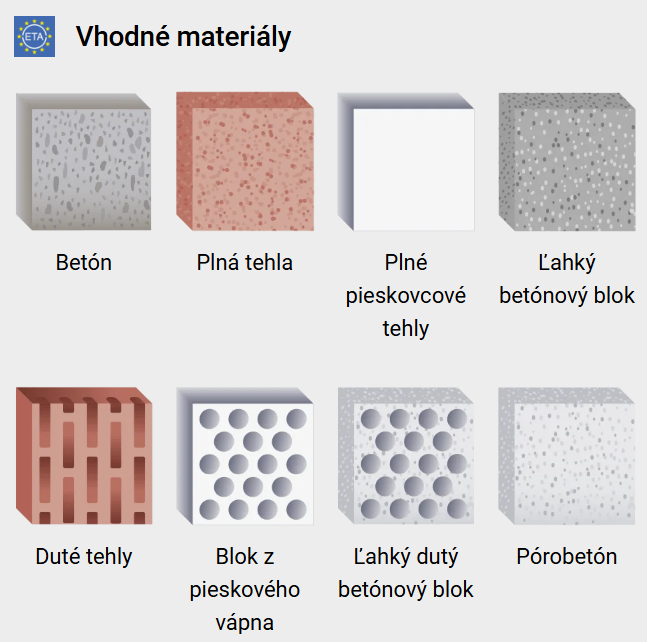 S injektážnou maltou ResiFIX VY ECO SF máte univerzálny produkt pre rôzne aplikácie: Pre vašu bezpečnosť je ResiFIX schválený ETA pre trhlinový betón (možnosť 1) a murivo a dosahuje veľmi vysoké hodnoty zaťaženia. Vďaka tomu je ideálny pre ťažké upevnenia a umožňuje ukotvenie napr. kotviacich a závitových tyčí, oceľových brán, štvorhranných rúrok, ako aj skrutiek a skrutiek všetkých druhov do mnohých ďalších stavebných materiálov, ako sú dierované kamene, plné kamene a betón.