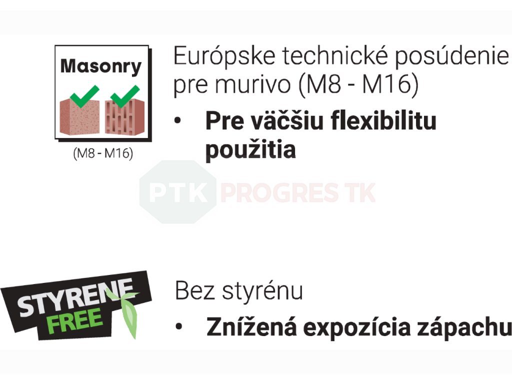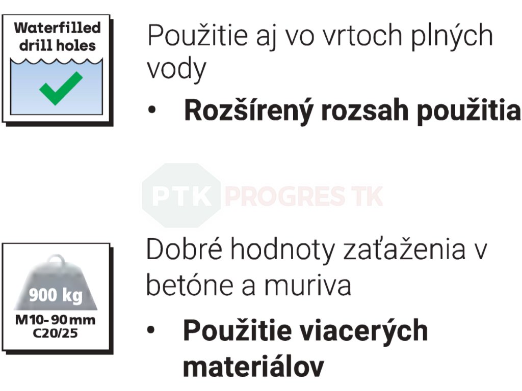 Použitie výrobku, napr. chemickej kotvy ResiFIX, je možné pre vodou plnené otvory, čo umožňuje rozšírený rozsah použitia.