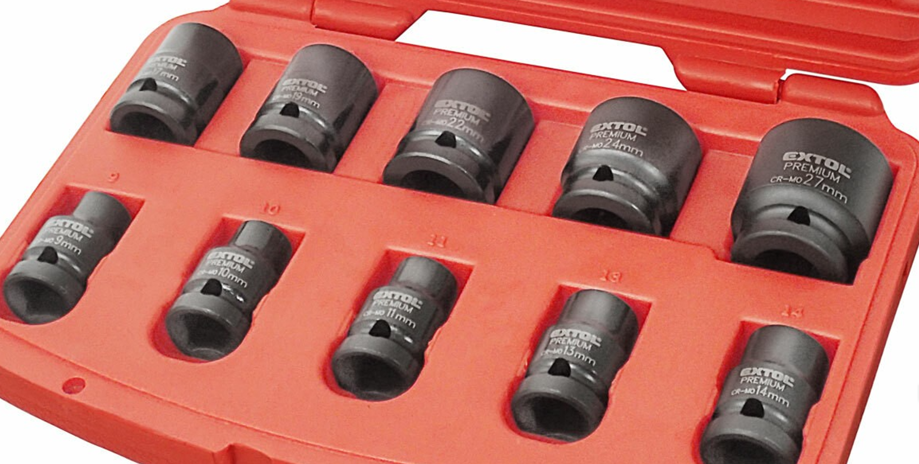 Sada obsahuje veľkosti 9, 10, 11, 13, 14, 17, 19, 22, 24 a 27 mm, čo pokrýva široké spektrum bežných úloh v dielni, servise alebo na vozidle. Od malých skrutiek až po vyžadujúce väčšie upevnenia – táto sada je všestranným pomocníkom pri opravách, údržbe či montážnych prácach.