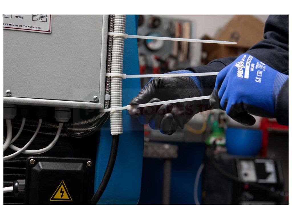 Biela nylonová sťahovacia páska je určená na upevňovanie prvkov, ako sú potrubia, hadice alebo káblové zväzky v interiéri. Robustná hlava a vnútorné ozubenie zabezpečujú pevné spojenie bez poškodenia upevňovaného predmetu. Flexibilný pás umožňuje rýchlu a jednoduchú montáž.