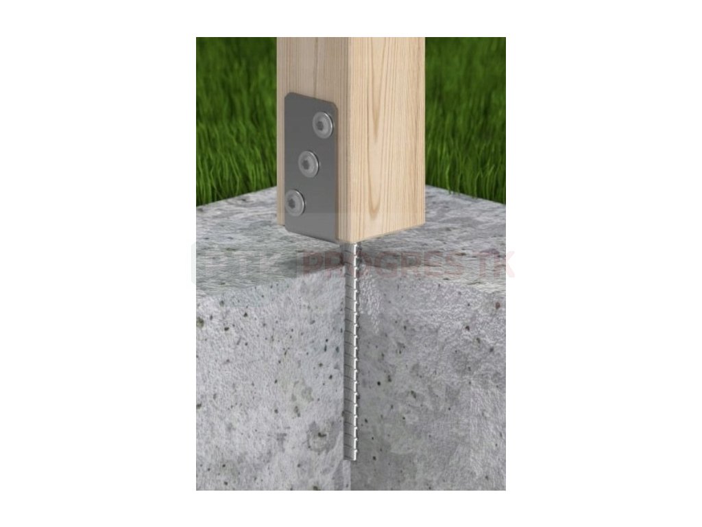 Ide o kovový spojovací prvok určený na ukotvenie dreveného stĺpika do betónu, zabezpečenie stability konštrukcie a oddelenie dreva od priameho kontaktu so základom.