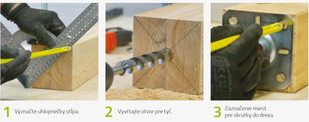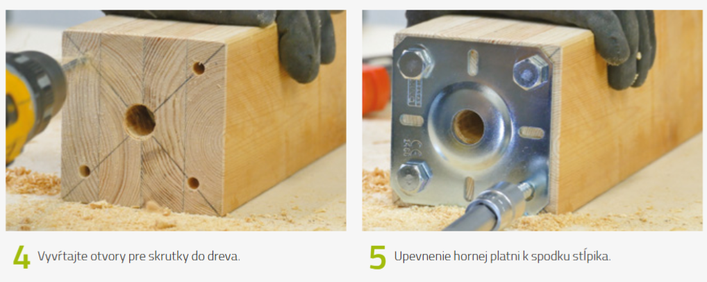 Drevený stĺp sa dá pripevniť pomocou skrutiek / kotiev v predvŕtaných otvoroch pätky. -