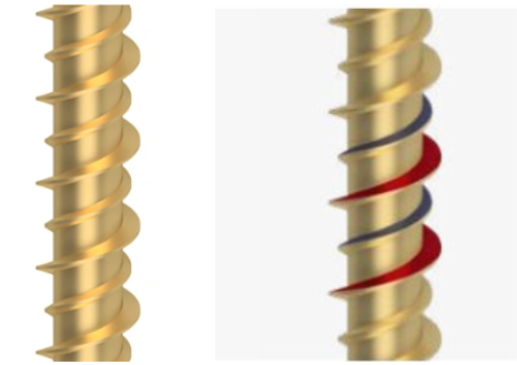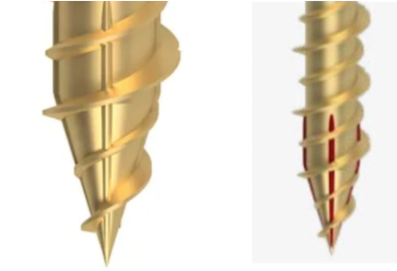 Rezné drážky na bokoch závitu znižujú vďaka svojej reznej funkcii riziko praskania dreva a odpor pri skrutkovaní.