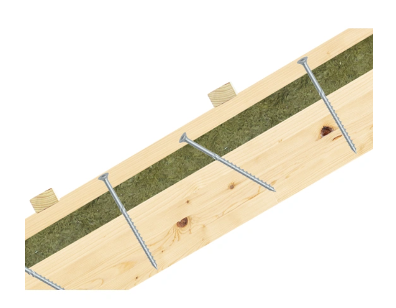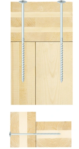 Pri doskách z lepeného dreva sa stropná doska pripevňuje na steny pomocou skrutiek StarDrive GPR. Skrutky Schmid sú vhodné pre všetky aplikácie v bočnom aj čelovom dreve (0° a 90°), ako aj na bočné a úzke plochy. -