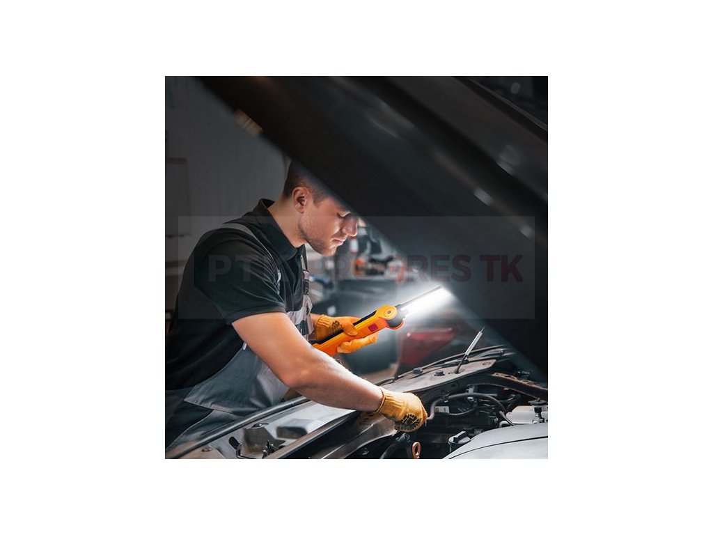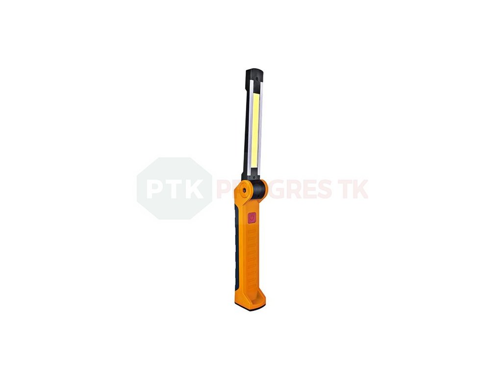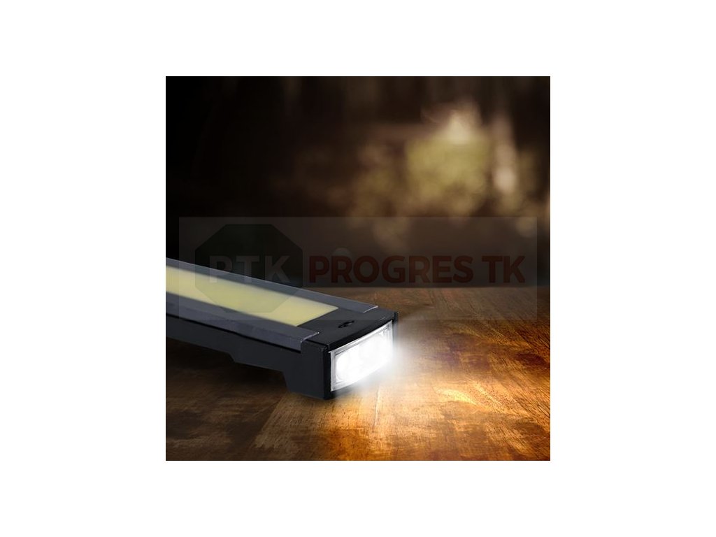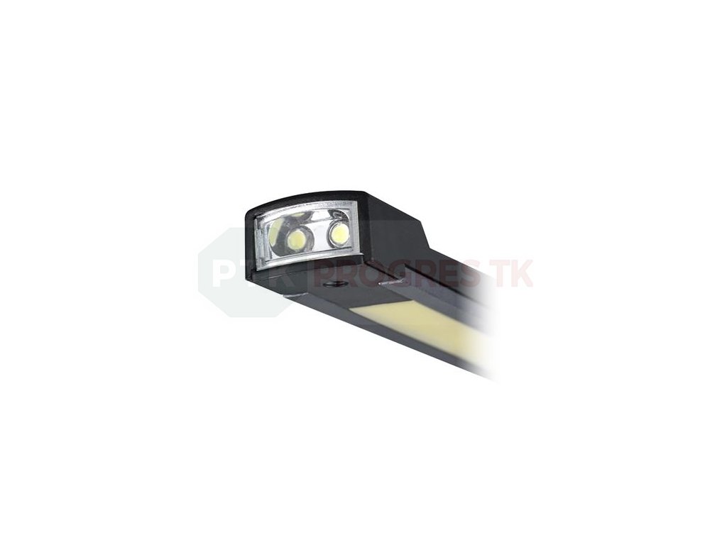 Kompaktná pracovná lampa s hlavným zdrojom COB LED (500 lm) a ďalšími 2× SMD LED (70 lm) ponúka 3 režimy osvetlenia: COB 100 %, COB 50 %, SMD 100 %. Vstavaná batéria (3,7 V / 1200 mAh) poskytuje až 10 hodín prevádzky a úplné nabitie trvá približne 4 hodiny.