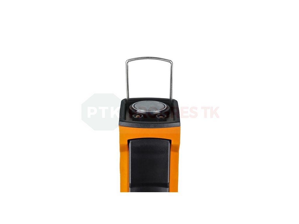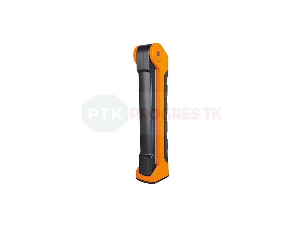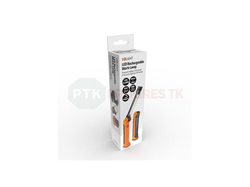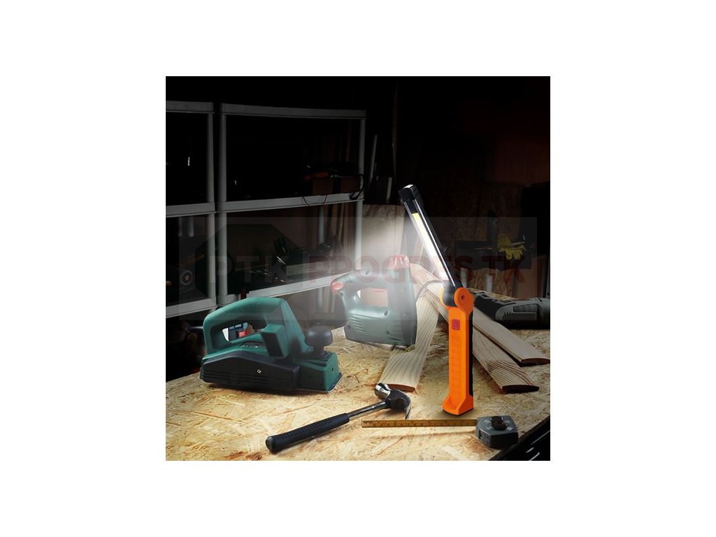 Kompaktná pracovná lampa s hlavným zdrojom COB LED (500 lm) a ďalšími 2× SMD LED (70 lm) ponúka 3 režimy osvetlenia: COB 100 %, COB 50 %, SMD 100 %. Vstavaná batéria (3,7 V / 1200 mAh) poskytuje až 10 hodín prevádzky a úplné nabitie trvá približne 4 hodiny.