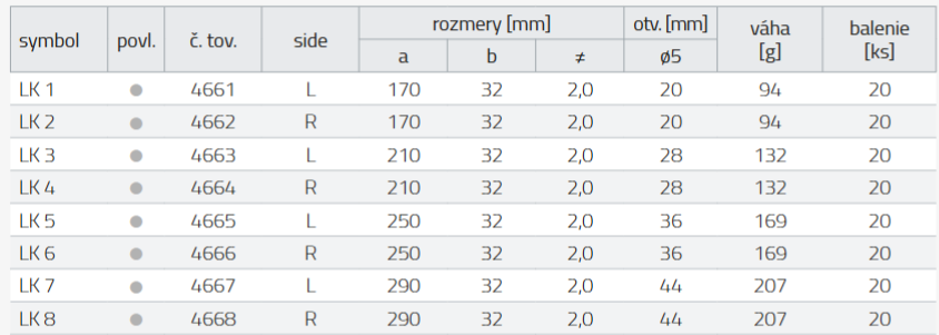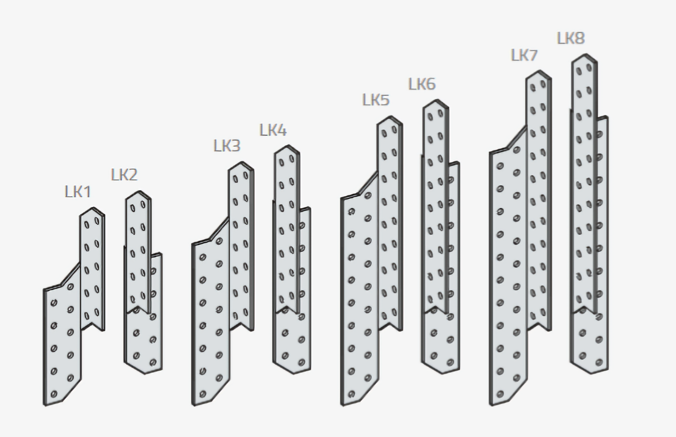 - Typy: Spojky sú dostupné v ľavom (LK1, LK3, LK5, LK7) a pravom (LK2, LK4, LK6, LK8) variante, čo umožňuje správnu inštaláciu z oboch strán krokvy.