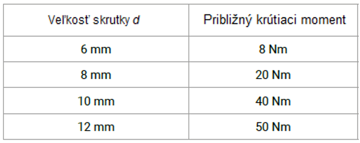 Nasledujúca tabuľka uvádza nastaviteľné hodnoty krútiaceho momentu pre skrutkovač podľa veľkosti skrutky. Tieto hodnoty slúžia ako orientačné pokyny a odporúčania.