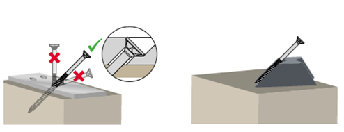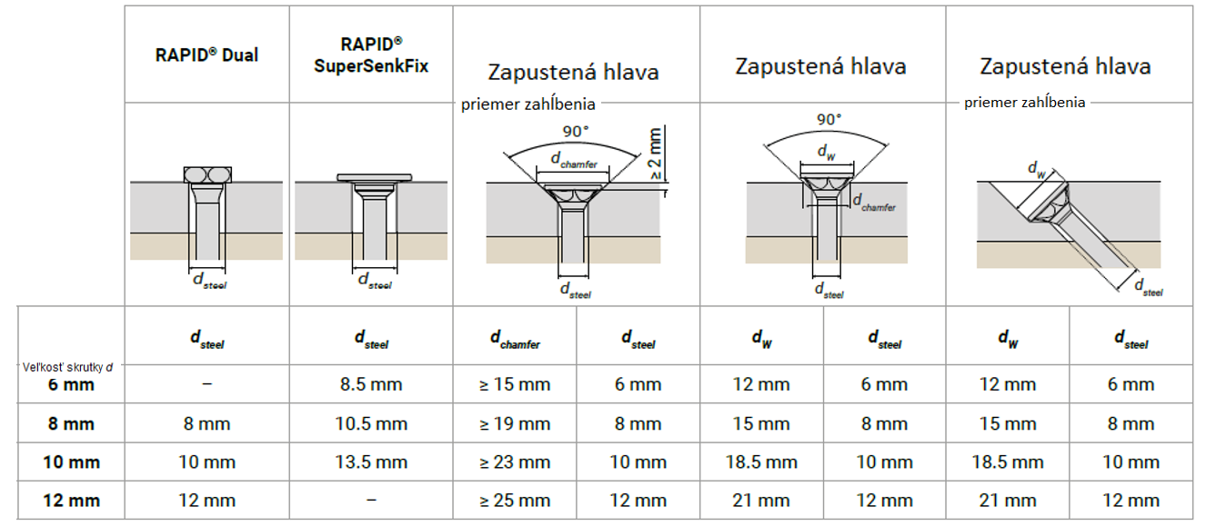 Pri spojeniach kov–drevo sa uistite, že skrutka zodpovedá otvoru. Skrutka so zápustnou hlavou vyžaduje zápustný otvor. Pri skrutkách s ramienkom musí otvor zodpovedať priemeru ramienka (pozri tabuľku nižšie). Uhol zaskrutkovania musí zodpovedať uhlu otvoru. Dbajte na to, aby sa skrutka nekrížila alebo nevychyľovala.