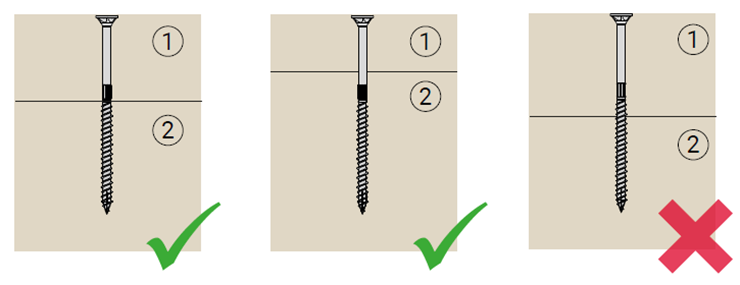 Poznámka: pri čiastočne závitových skrutkách musí byť montážne drevo (1) tenšie alebo rovnako hrubé ako dĺžka hladkej časti skrutky, aby bol závit úplne zaskrutkovaný do nosného dreva (2).