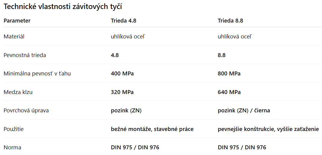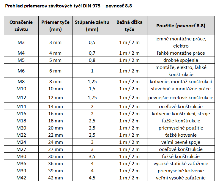 Závitová tyč podľa normy DIN 975 v pevnostnej triede 8.8 je určená pre náročné montážne a konštrukčné aplikácie, kde je požadovaná vyššia pevnosť spoja. Tyč je vybavená metrickým závitom po celej dĺžke, čo umožňuje jednoduché skracovanie a flexibilné použitie v rôznych montážnych systémoch.