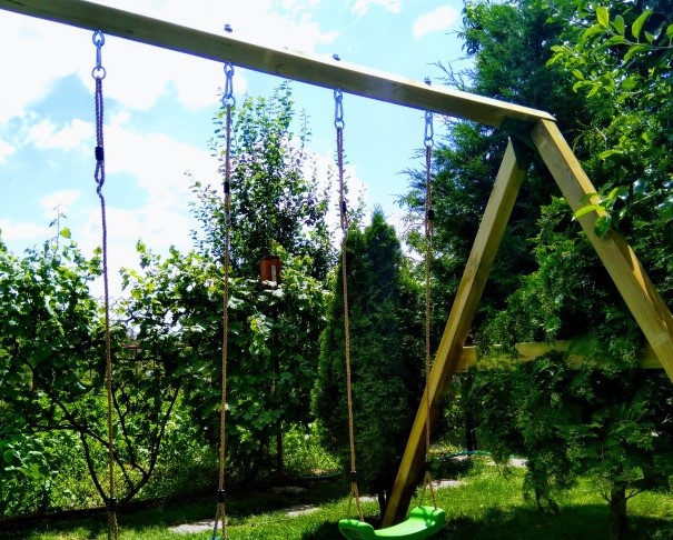 Vybavenie: Súčasťou je karabína (alebo oko), ktorá umožňuje jednoduché pripojenie lana alebo reťaze hojdačky bez potreby ďalšieho náradia.